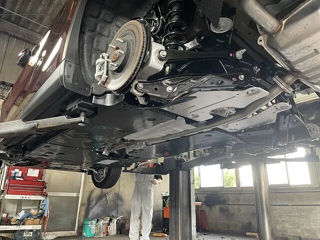 最近のお車は、静粛性や燃費向上のため、下回りにカバーがされていることが多いです。このCX-80は前から後ろまでびっちりとカバーされておりました。しかし隙間から塩カルが入り、鉄部分をサビさせますので、カバーを外しサビ止めを実施します。