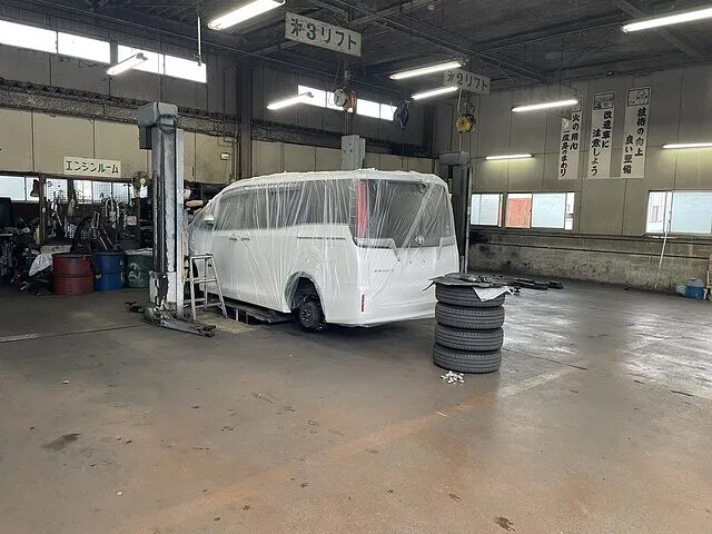ボディへ塗装が飛散しないように養生シートをかけていきます。